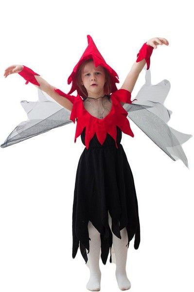 Детский костюм ведьмочки включает в себя длинную юбку с неровным подолом, кофту с красным воротником и сетчатыми вставками. Также в комплект входит красная конусная шляпа.