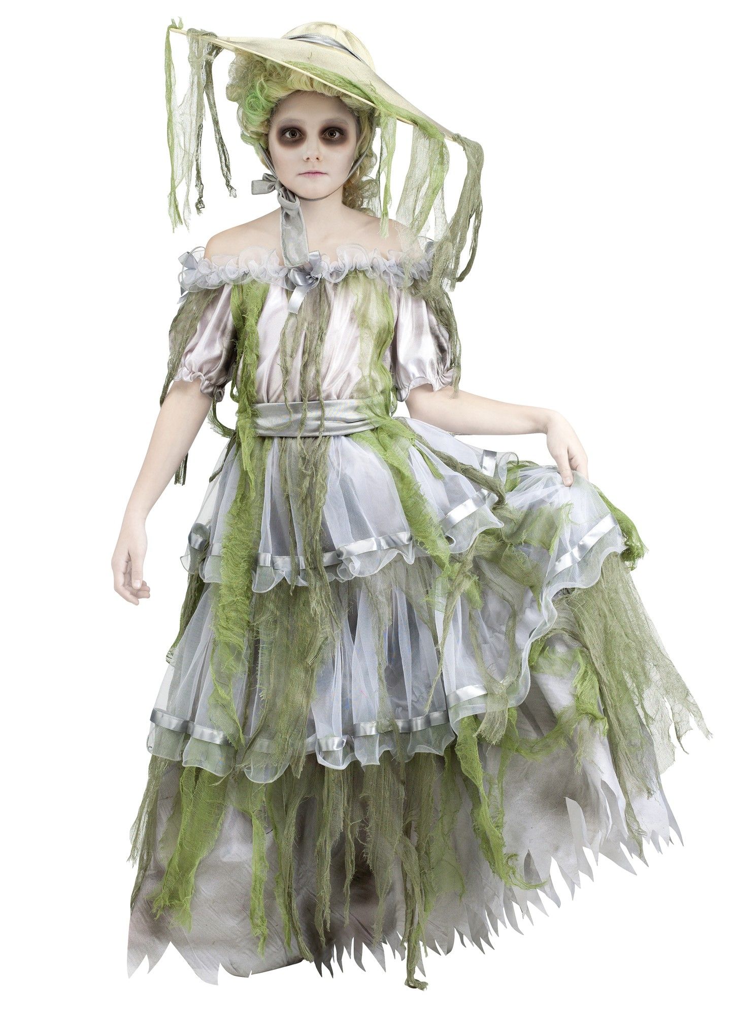 Детский костюм Зомби-Южной красавицы включает в себя длинное пышное платье с поясом, выполненное из серо-белого легкого материала с зелеными оборванными вставками, подол платья также оборван. Платье со спущенными плечиками. К платью прилагается большая шляпа на завязочках.