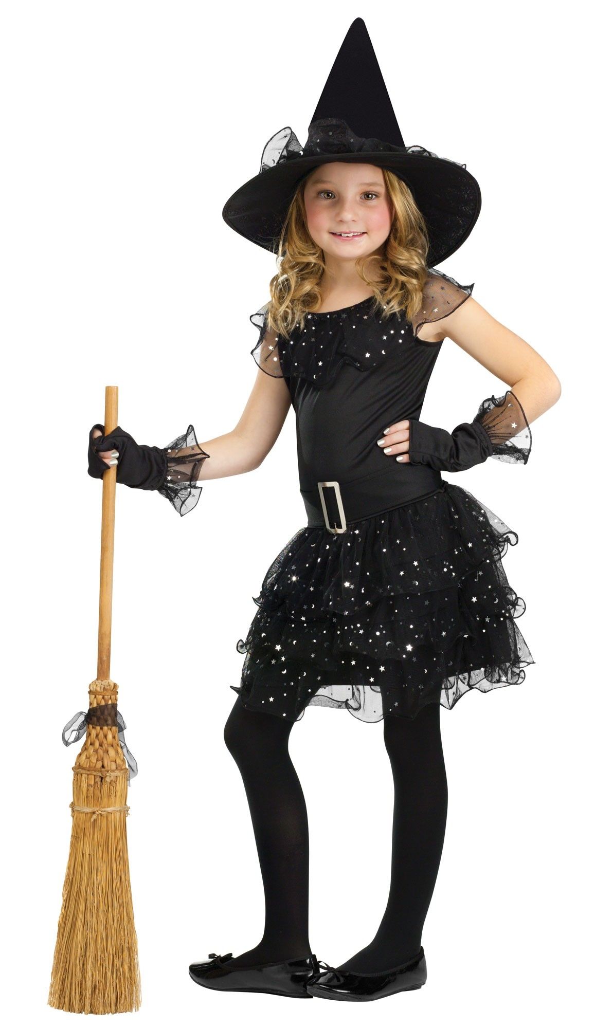 Детский костюм Блестящей ведьмочки выполнен в черном цвете. В комплект входит платье с пышной короткой юбочкой с блестками. К платью прилагается ремень, перчатки без пальцев и конусная шляпа, украшенная тюлевым материалом.