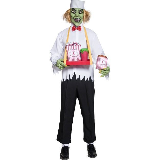 Костюм жуткого циркового разносчика прекрасно подойдёт для Хэллоуина, Пятницы 13 и прочих подобных праздников. В комплекте костюма имеется рубашка, шляпа с волосами, зелёная маска, зелёные перчатки, поднос и питание. Такой костюм может напугать кого угодно.