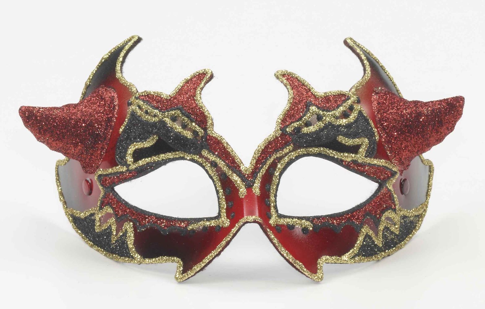 Венецианская красно-черная маска с рожками сможет стать прекрасным дополнением к костюмам дьяволов и дьяволиц. Маска выполнена в красном цвете и украшена черными, красными и золотыми блестками.