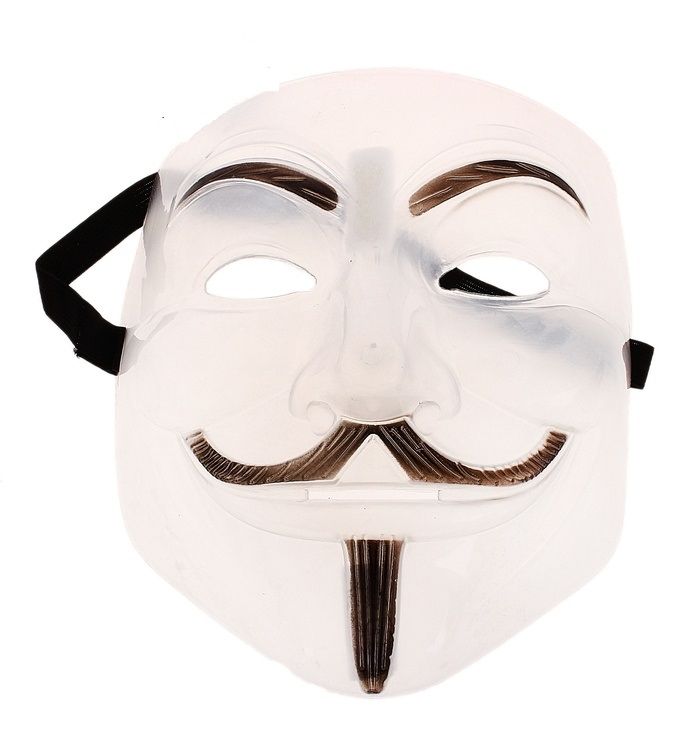 Маска Вендетта светящаяся в темноте с черными усами и тонкой аккуратной бородкой. Маска изготовлена из пластика и имеет размер 9х16,5х20 см.