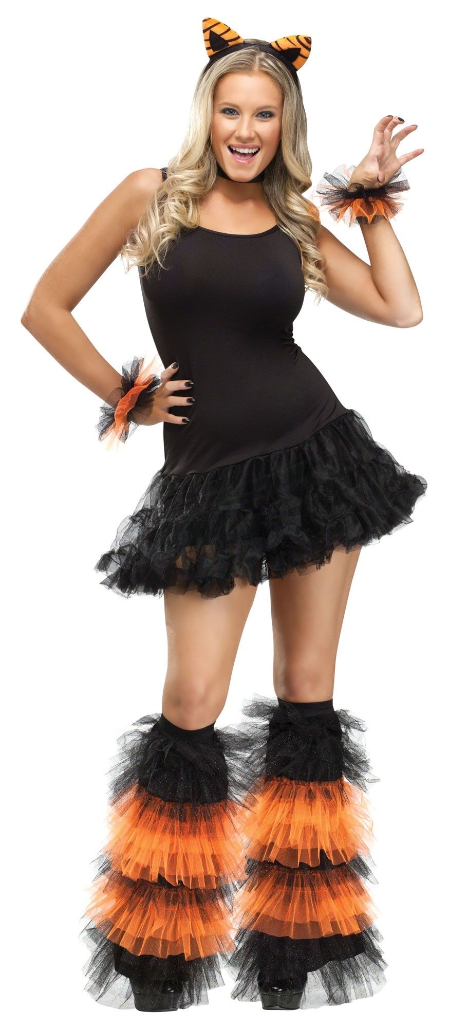 Набор аксессуаров из тюли оранжевый включает в себя манжеты и гетры с блестками. Они выполнены в черно-оранжевую полоску. Напульсники и гетры пышные, что придаст легкости в ваш образ. На фото представлен пример костюма.