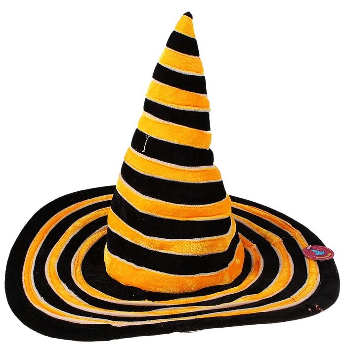 Полосатая шляпа ведьмы - это высокая шляпа конусной формы с небольшими полями, выполненная в оранжевом и черном цветах. Шляпа придаст яркости костюмам ведьм и послужит замечательным аксессуаром на Хэллоуин и другие костюмированные вечеринки. Размер шляпы примерно 47 × 47 × 42 см.