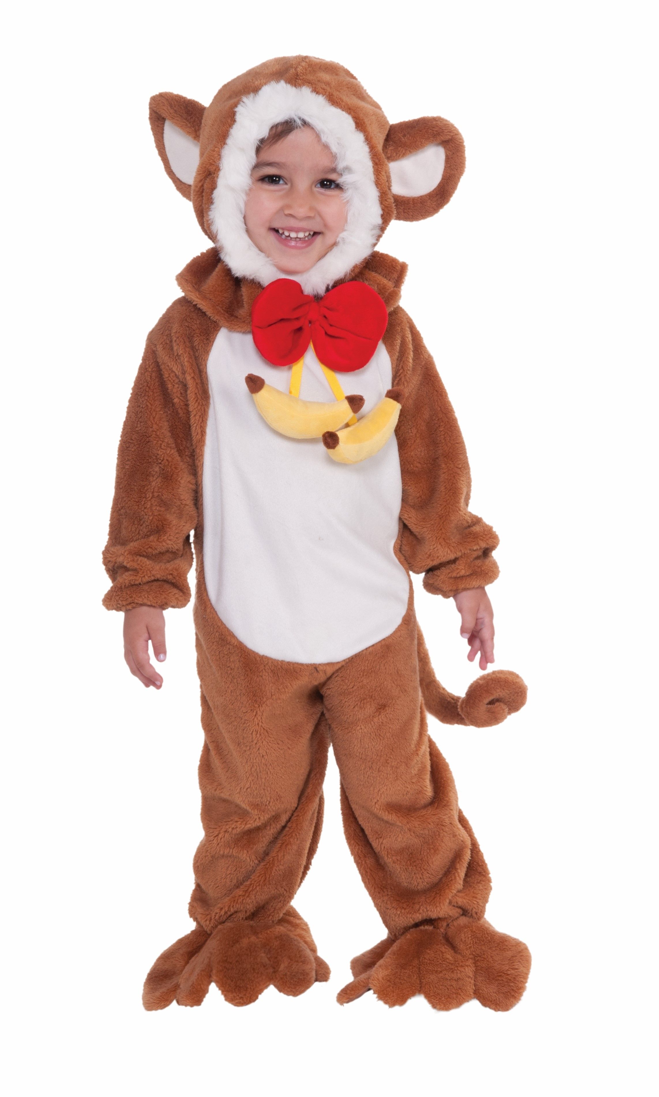 Костюм маленькой обезьянки - теплый плюшевый костюм для детей, в комплект которого входит комбинезон коричневого цвета с белой вставкой спереди. К комбинезону пришиты лапки и хвост. Также в комплекте имеется капюшон с ушками обезьянки. Красный бантик и мягкие бананы украшают костюм.