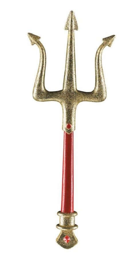 Трезубец выполнен в золотом цвете, рукоятка в красном. Также имеется чёрная подвязка. Такой трезубец прекрасно дополнит образы дьяволов и дьяволиц. Размер трезубца составляет 25 см.