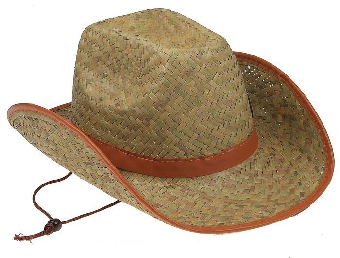 Ковбойская шляпа из соломы идеально дополнит костюмы ковбоев. Шляпа декорирована светло-коричневой окантовкой и ремешком. Размер шляпы 38 × 25 × 12 см.