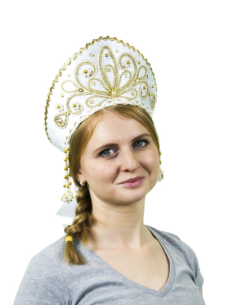 Белый кокошник Девичий - белый атласный миниатюрный кокошник с золотистыми узорами из тонкой тесьмы и бусинок. Кокошник с отделкой из золотистой тесьмы.