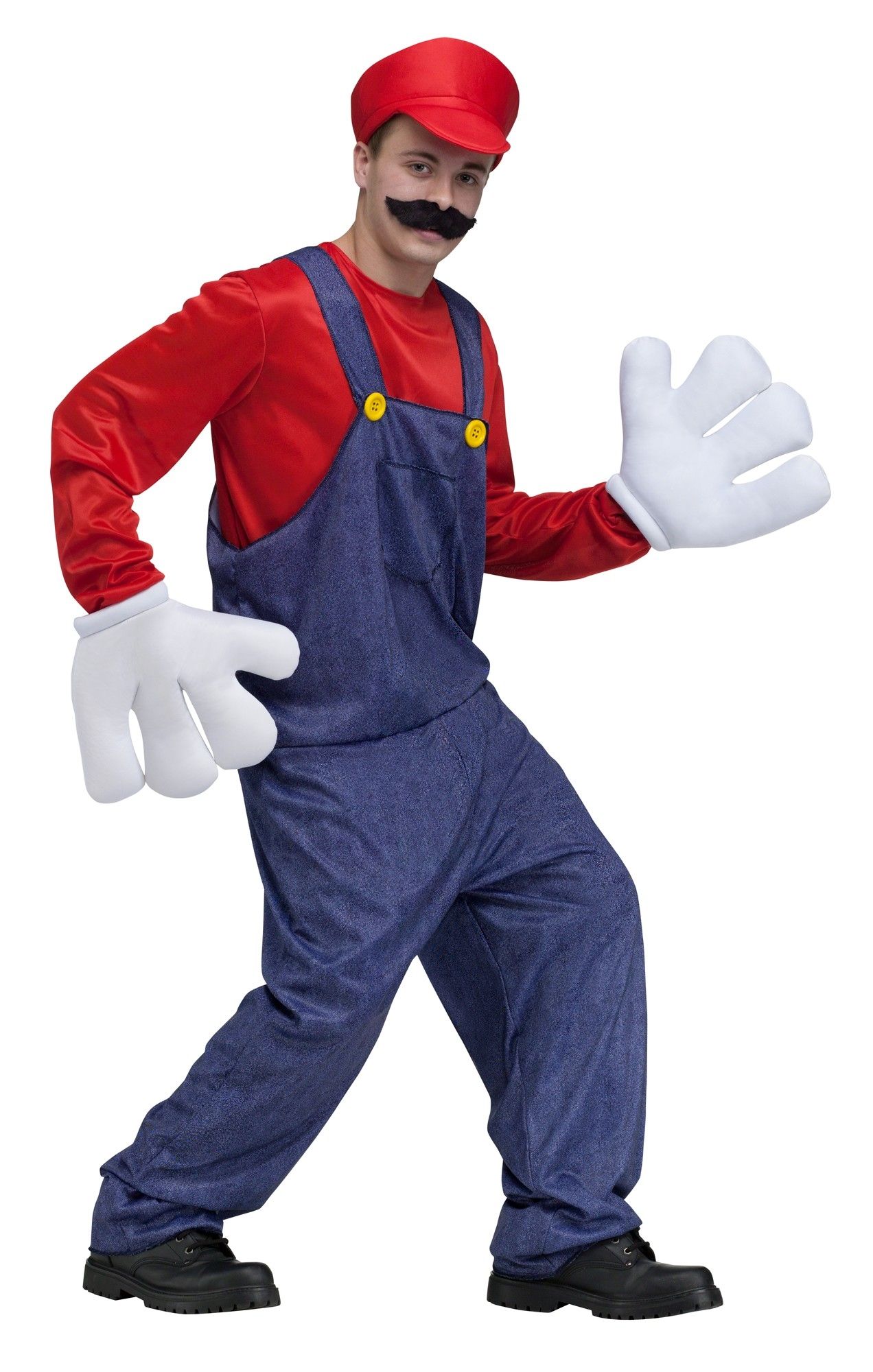 Костюм Марио из игры для взрослых станет прекрасным выбором для костюмированной вечеринки. В комплекте имеется синий комбинезон с желтыми пуговицами. Красная кофта с длинными рукавами, кепка и черные накладные усы дополняют костюм. А завершают образ мультяшные большие перчатки-руки белого цвета.