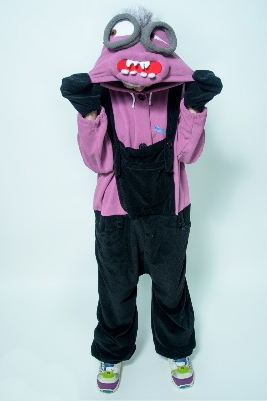 Кигуруми Миньона Кевина выполнен из мягкого плюшевого материала фиолетового и темно-синего цветов. Отлично подойдет для катания на сноуборде, лыжах и коньках.