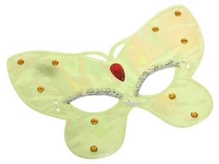 Пластиковая маска бабочки салатового цвета с усиками, маленькими камушками желтого цвета и красным камнем по центру. Размер маски 14х16 см.
