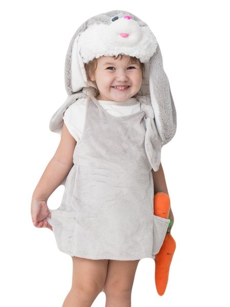 Детский костюм заюшки - мягкий меховой костюм, выполненный в сером цвете. В комплект костюма входит сарафнчик, завязывающийся на плечиках, меховая шапка-маска с длинными ушами, а также оранжевая мягкая морковка.