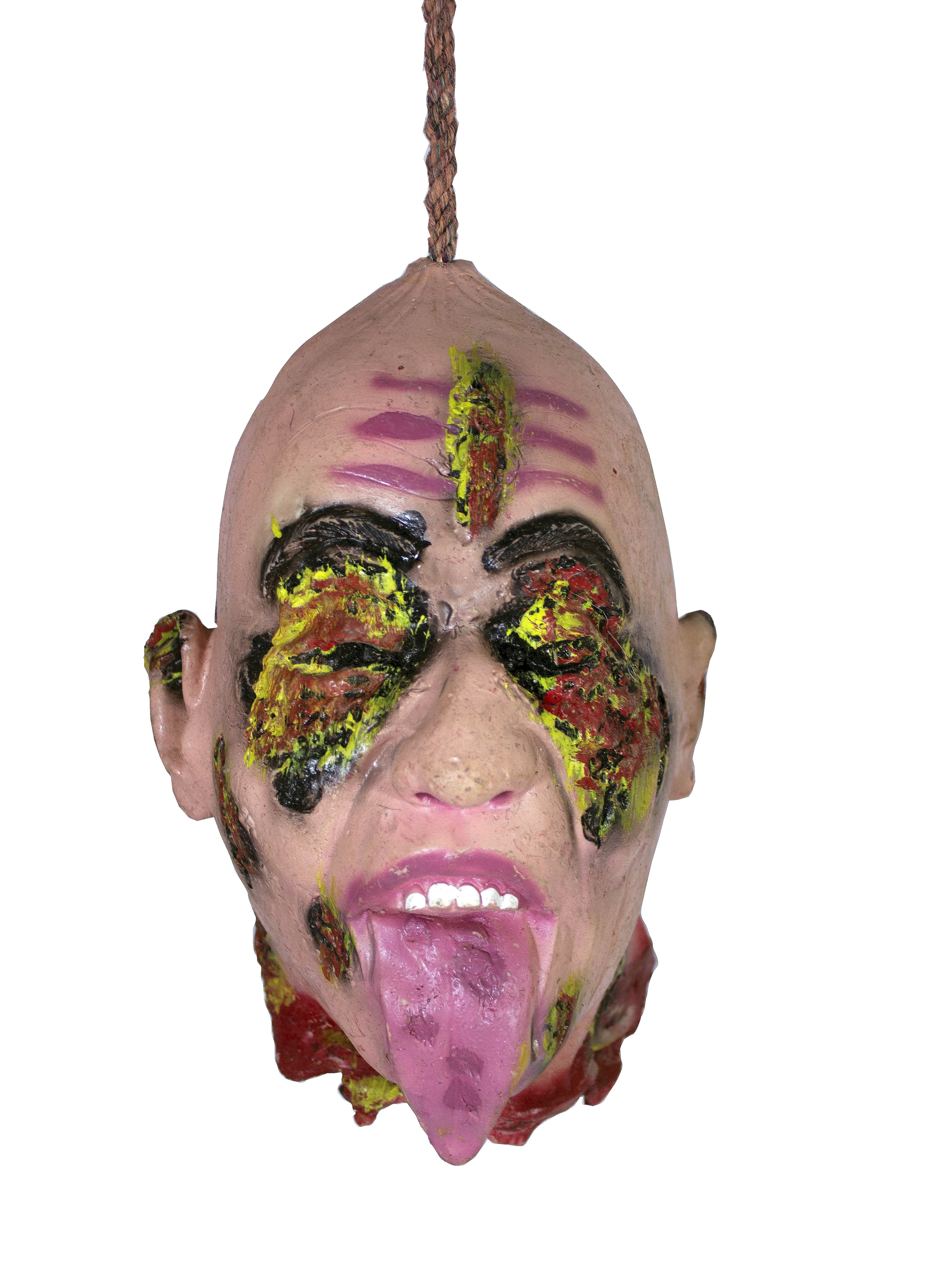 Подвесная голова с выжженными глазами выполнена из прочного латексного материала. Подвесная голова человека с выжженными глазами и высунутым языком, а также ранами в некоторых местах. Подвешивается за толстую веревку.