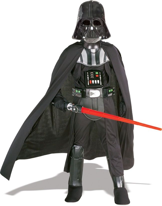 Костюм Дарт Вейдера для детей включает в себя комбинезон с литыми деталями и прикрепленными к нему голенищами, литую маску со шлемом, пояс, длинный черный плащ и световой меч красного цвета.
