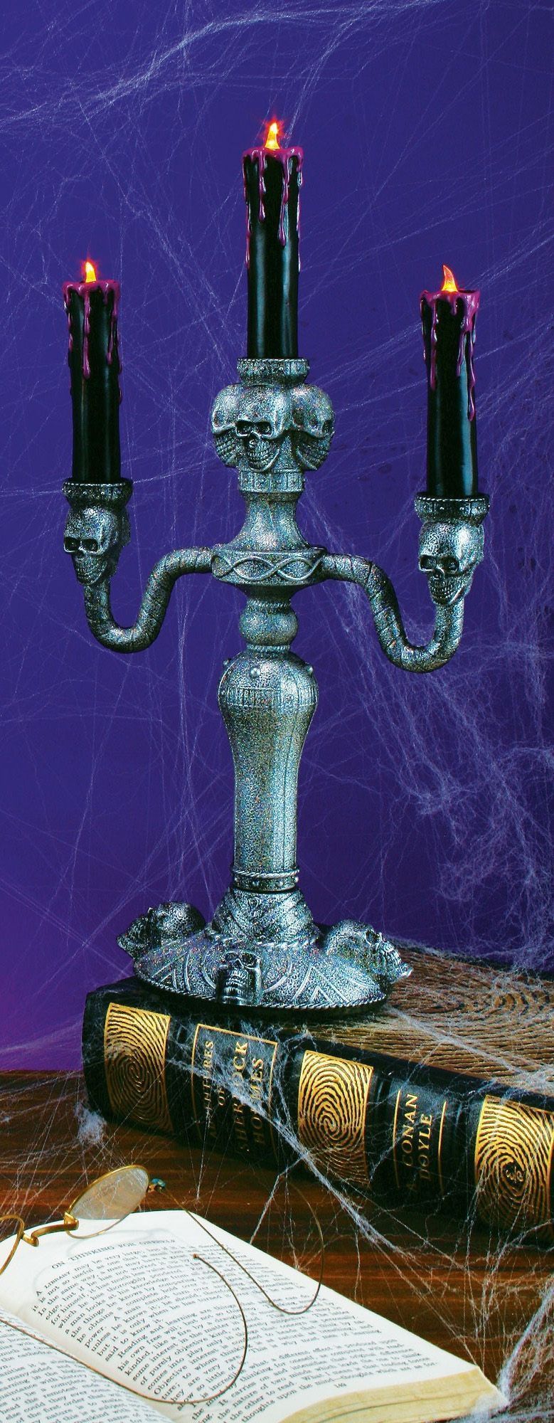 Блестящий серебряный канделябр выполнен в старинном стиле и украшен черепами. У канделябра имеется три ответвления с тремя черными светодиодными свечами. Вместо огонька, на каждой свече лампочка и стекает с них фиолетовый воск. Такой канделябр станет хорошим украшением комнаты на Хэллоуин и другие подобные праздники.