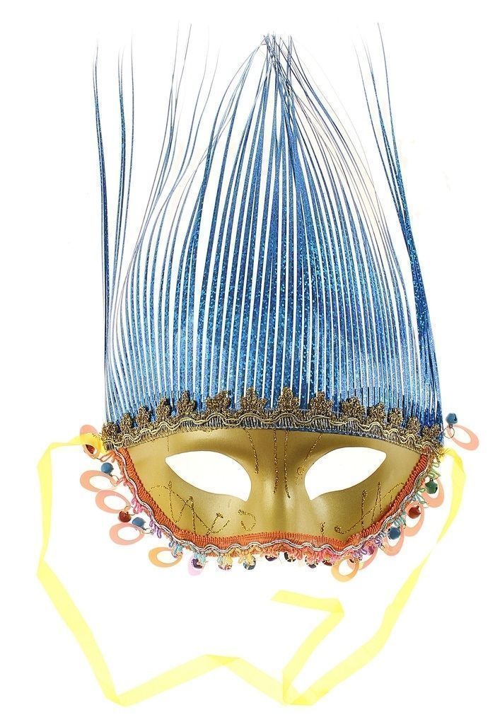Карнавальная маска нимфы золотисто-синего цвета с разноцветными бусинками снизу. Размер маски 20х36 см.