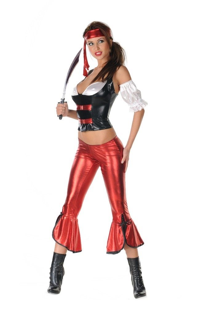 Очень привлекательная пиратский костюм состоит из четырех частей. Черно-белый лиф крепится сзади на молнии и украшен красными полосами с пряжками. Узкие брюки с сексуальными жабо, открытые сзади, связаны лентой. Два рукава с кружевом и повязка на голову. Меч в комплект не входит.