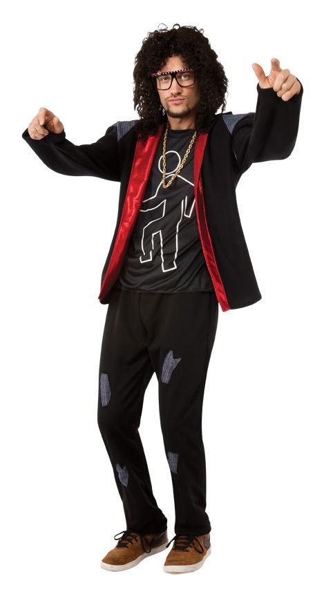 Костюм рэпера Скай Блю включает в себя курточку с капюшоном с прикрепленной рубашкой, а также черные брюки с серыми заплатками.