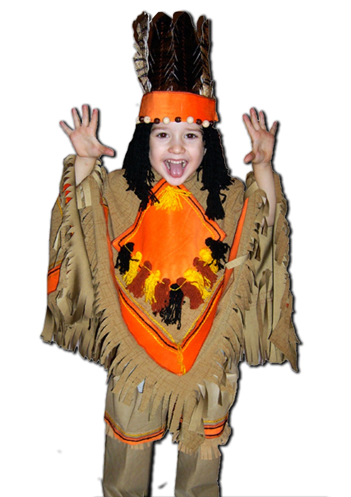 Костюм маленького индейца включает в себя яркий оранжевый головной убор с черными перьями и пришитыми волосами, коричневый плащ-пончо с бахромой и яркой оранжевой вставкой, накладки на обувь, а также колчан для стрел.