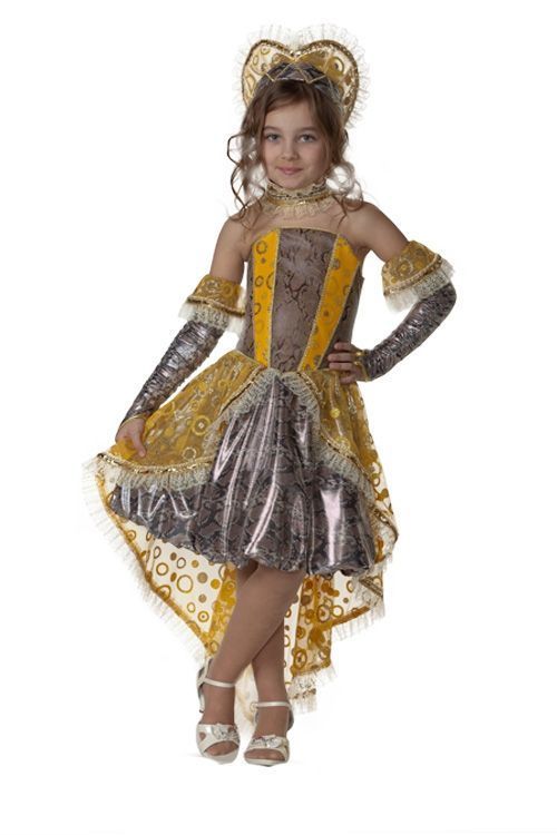 Детский костюм Королевской Змейки включает в себя двухслойное шикарное платье с корсетом, тканевое ожерелье, а также изящный головной убор в тон платью. Такой костюм непременно понравится маленьким девочкам, которые любят сказки и волшебство. Этот костюм ваша девочка может надеть на Новогодний утренник и любой другой праздник.