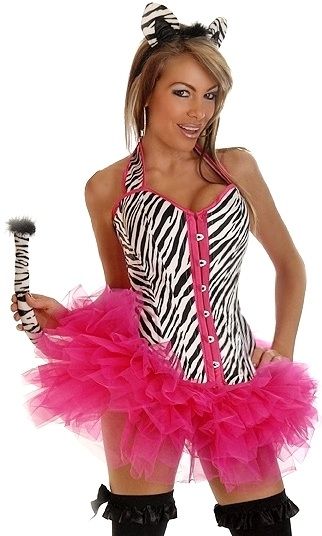 Костюм милашки-зеброчки включает в себя полосаты черно-белый корсет, который застегивается спереди при помощи крючков. Корсет с одной лямкой через шею. Сзади имеется шнуровка. К корсету также прилагаются соответствующие стринги. А полосатые ушки и длинный хвостик идеально дополняют образ зебры. Также имеется короткая розовая пышная юбочка.