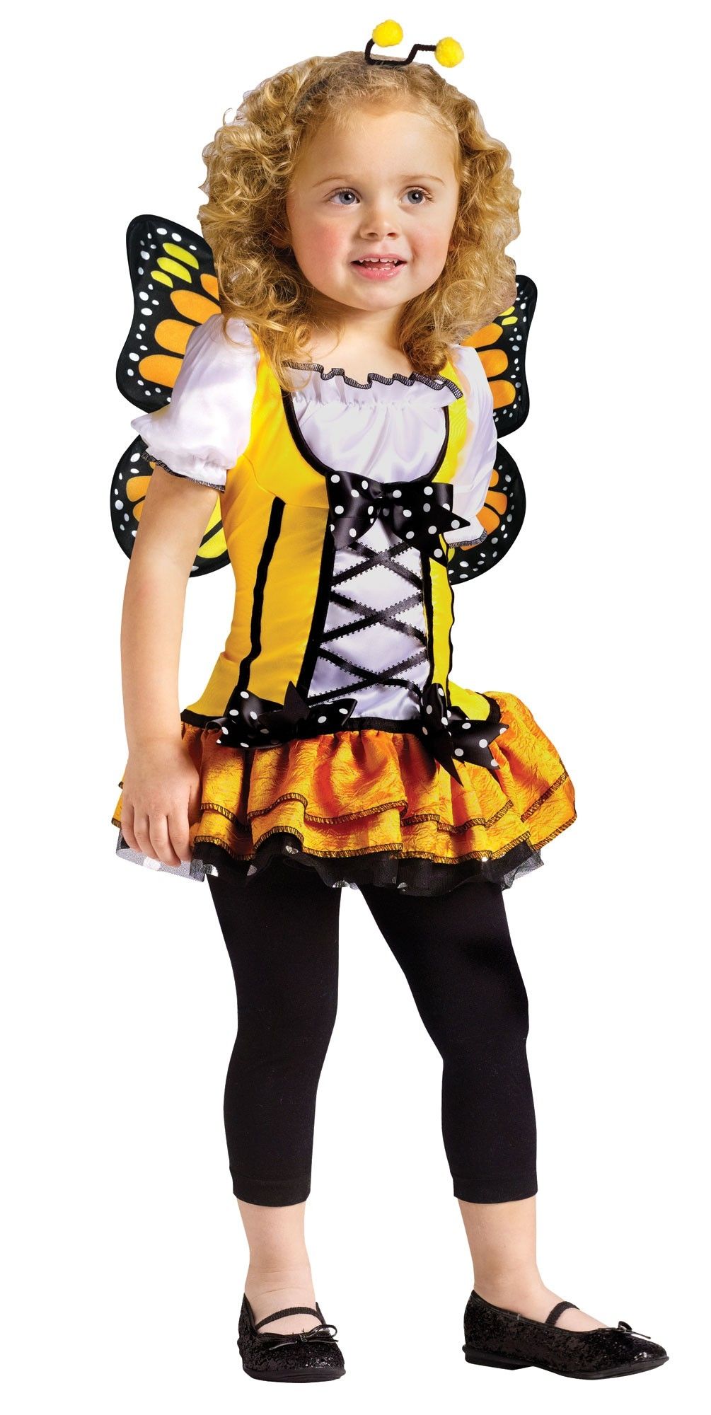 Костюм малышки Бабочки Принцессы - это яркое желтое платье с пышной юбочкой. Платье украшено черной шнуровкой спереди и небольшими бантиками ну груди и юбочке. К платью прилагаются яркие желтые крылья с черными узорами, а также рожки-антенки.