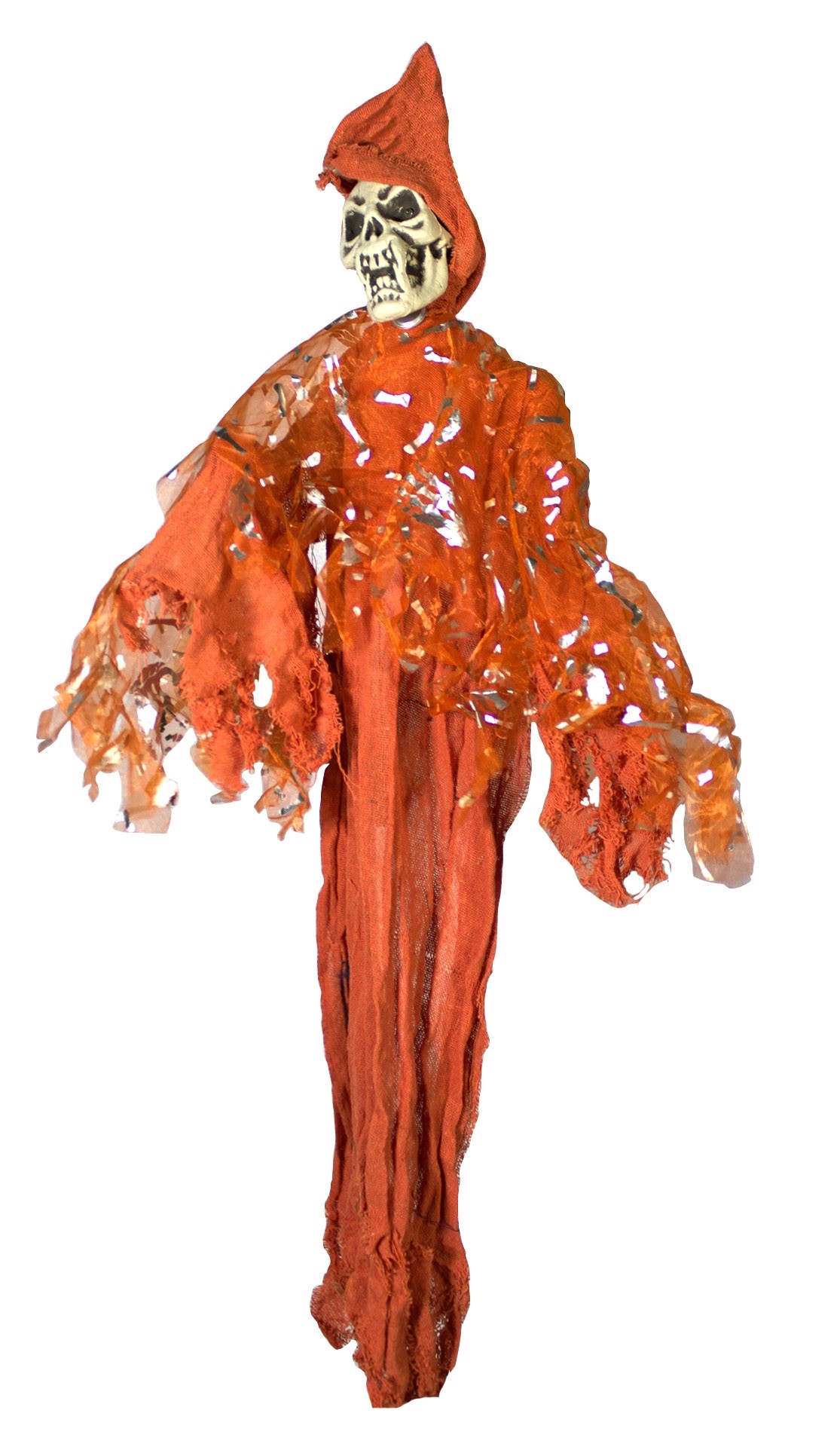 Подвесная декорация Скелет оранжевый - яркая декорация, которая отлично подойдет для украшения помещения на Хэллоуин. Декорация представляет собой скелет в оранжевом одеянии с капюшоном.