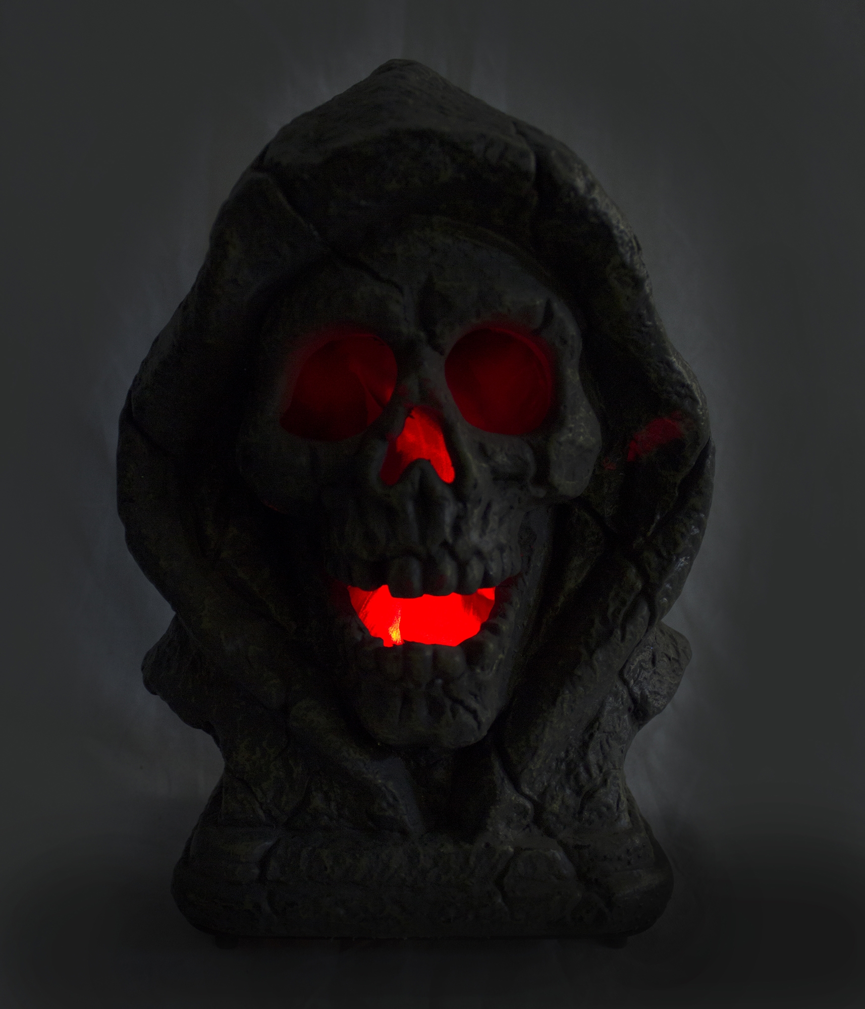 Светящийся бюст смерти выполнен из пластикового материала серо-зеленого цвета. Бюст представляет собой череп с капюшоном. В декорации имеется полое пространство, внутри лампочки красного цвета.