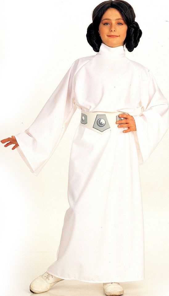 Детский костюм принцессы Леи, из знаменитой саги Star Wars, включает в себя белое длинное платье с длинными рукавами, пояс, а также черный парик с прической Леи.
