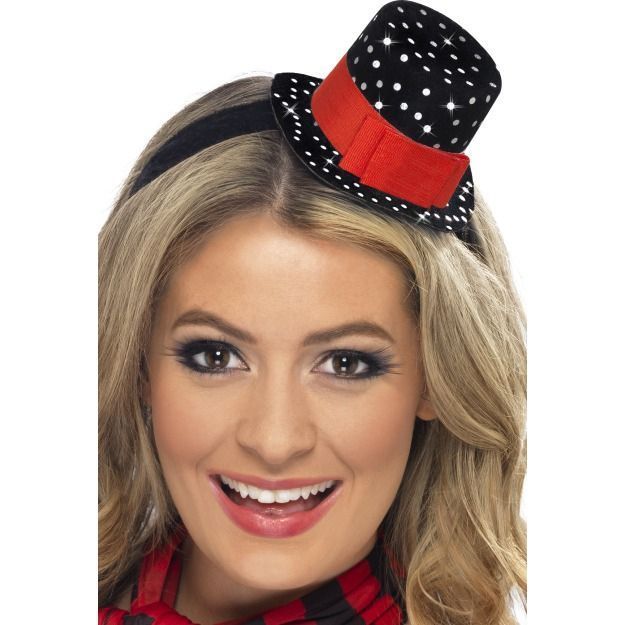 Мини-шляпка в горох выполнена в черном цвете и украшена мелким белым горохом, а также красным бантиком. Шляпка держится на черном широком ободке. Идеальна для новогодних вечерних нарядов.