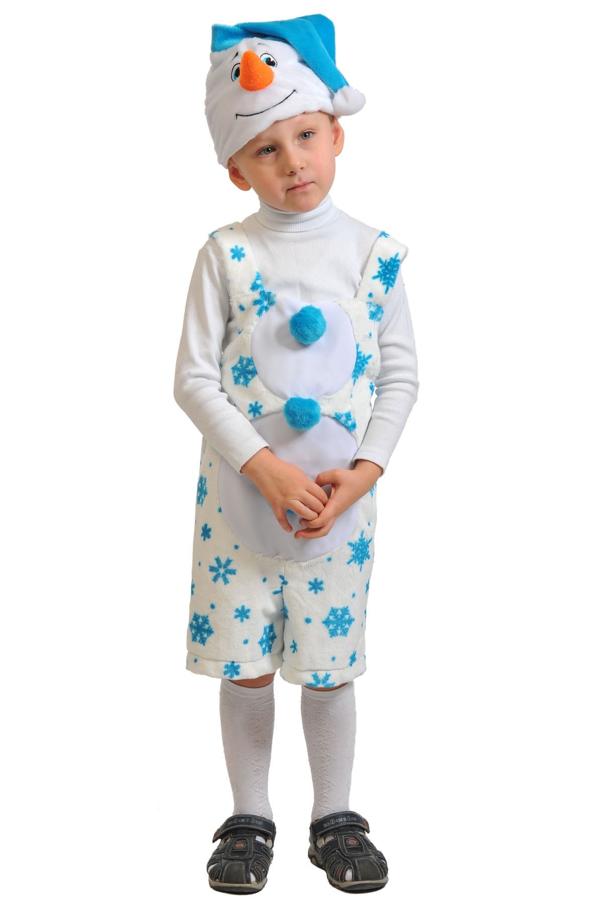 Детский плюшевый костюм милого снеговичка отлично подойдет для детских утренников в Новогоднюю пору. Костюм включает в себя белый комбинезон с голубыми снежинками и помпонами и колпак с улыбающейся мордочкой.