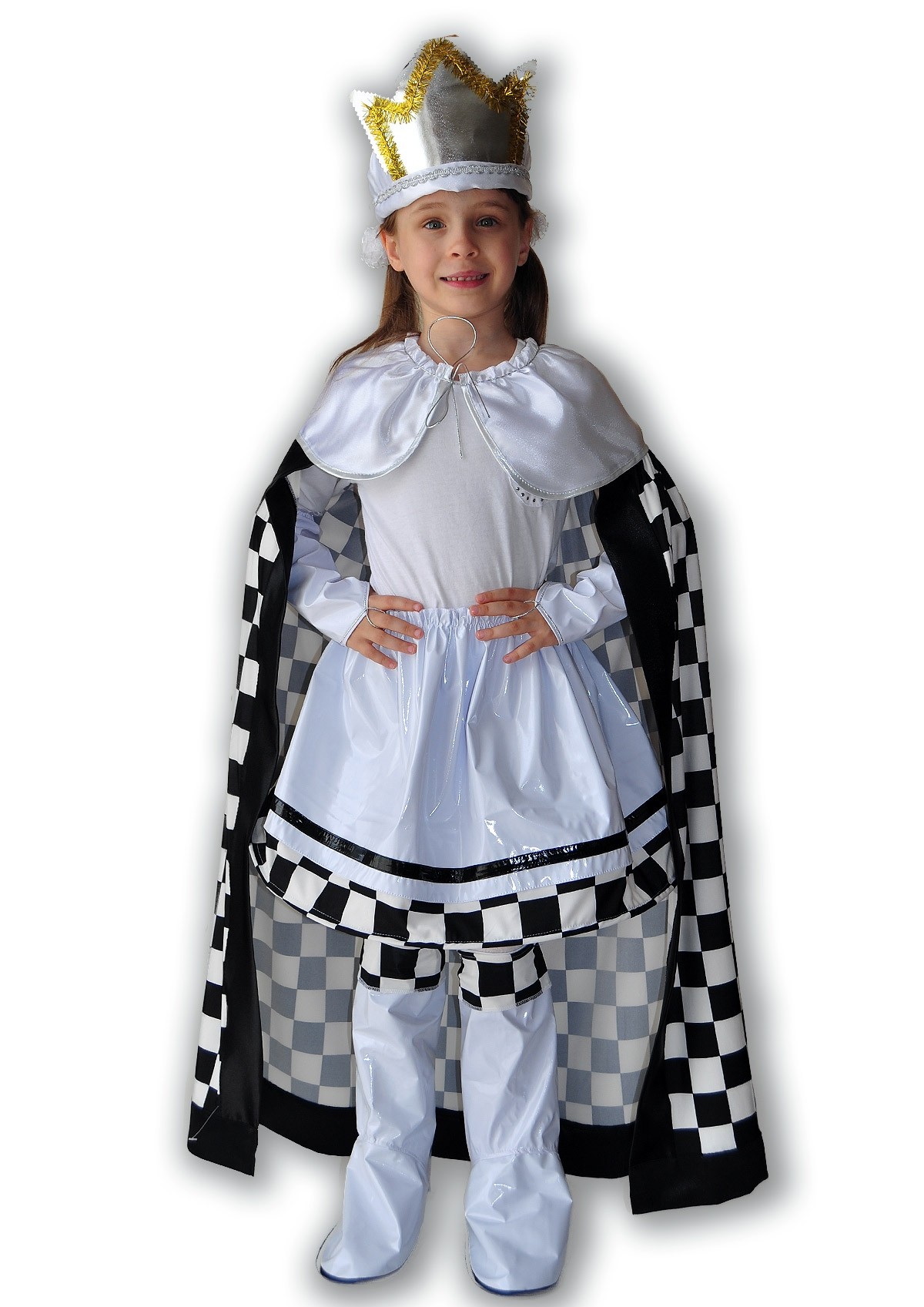 Детский костюм Шахматной Королевы - черно-белый костюм сказочной королевы, в комплект которого входит пышная белая юбка с черно-белым подолом, длинный плащ в черно-белый квадрат, серебряная корона с золотистой отделкой, выполненная из мягкого материала, белые перчатки без рукавов, а также белые накладки-сапоги.