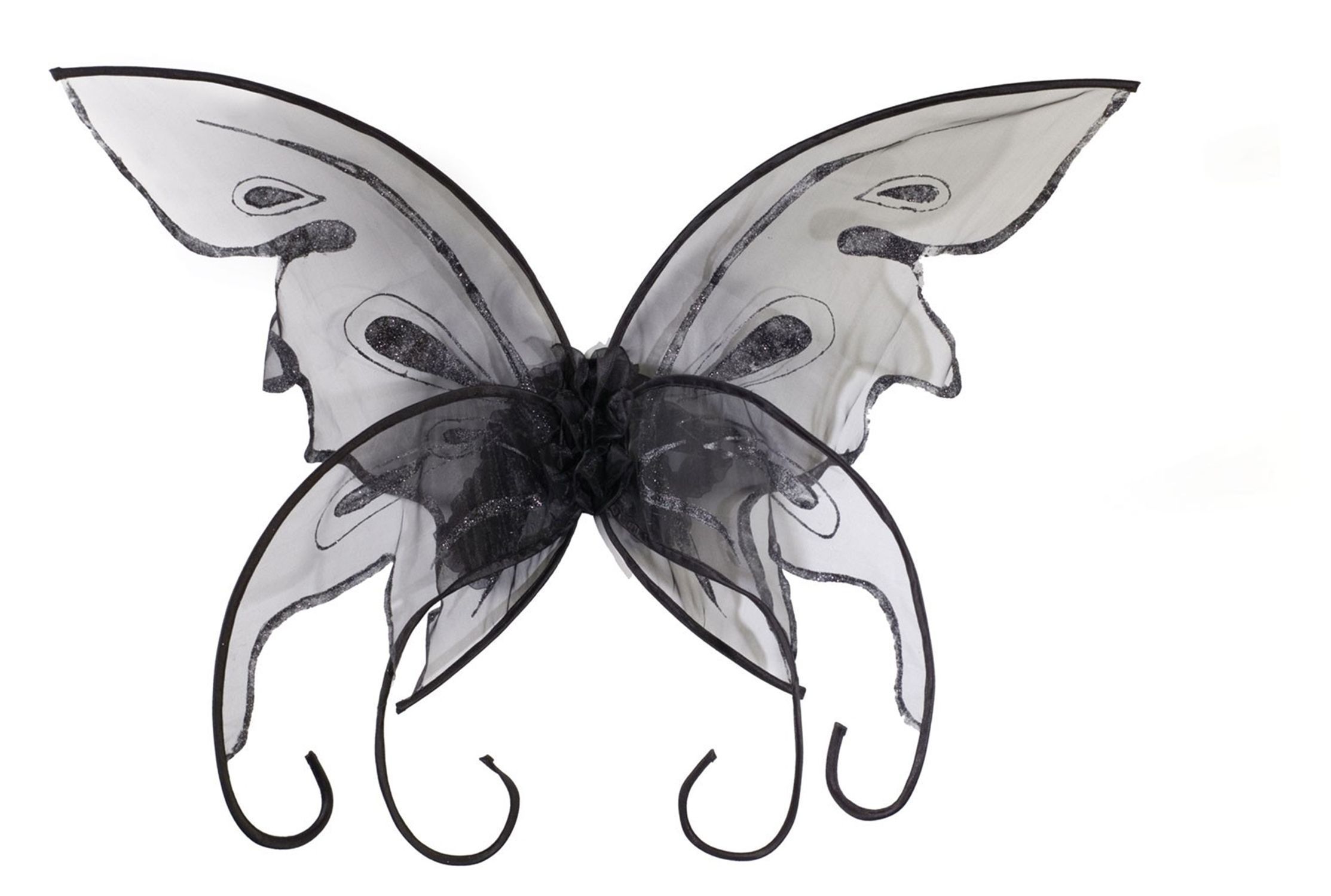 Черные крылья Бабочки - это легкие крылышки, которые состоят из черного тонкого каркаса с закругленные краями. К нему прикреплен тонкий сетчатый материал серого цвета с узорами, который и составляет основную часть крыльев.