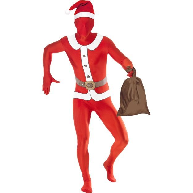 Костюм Санты Вторая Кожа включает в себя комбинезон, который покрывает все тело с головой, а также коричневый мешок. Комбинезон выполнен в красном цвете из эластичного материала, спереди имеется рисунок пиджака Санты с ремнем. Сзади на спине имеется молния.