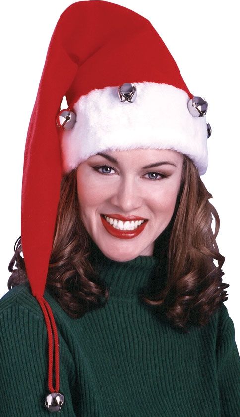Длинная шляпа Санты выполнена в красном цвете, у нее длинный хвостик, который украшен маленьким колокольчиком. На шляпе имеется белая меховая отделка, к которой прикреплены маленькие бубенчики.