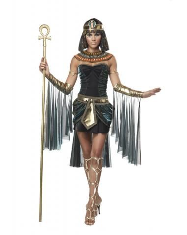 В костюме египетской богини в черном вы будете соблазнительны, сексуальны и неповторимы. Костюм представляет собой изящное платье с золотистым поясом, воротник, расшитый камнями, головной убор и длинные перчатки, драпированные прозрачной легкой тканью. Дополнительно на нашем сайте вы можете приобрести обувь и парик.