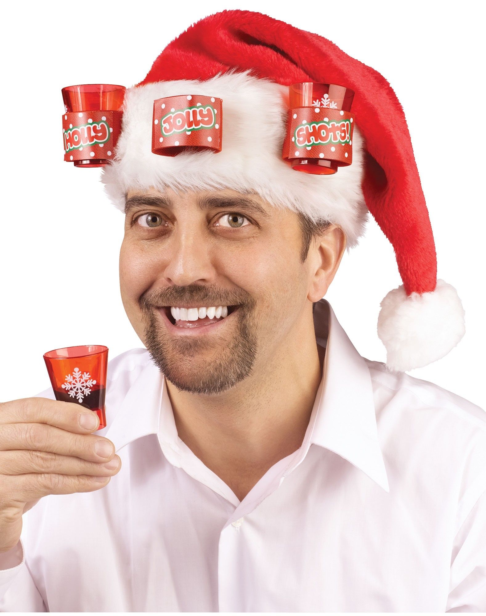 Шапка Санты с рюмками - красный колпак с белым помпоном на конце и белой опушкой на отвороте. Также к отвороту пришиты три петли для трех красных рюмок с белыми снежинками.