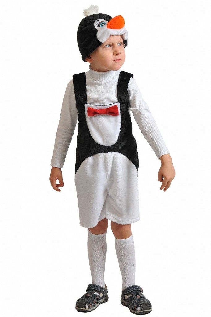 Плюшевый костюм пингвинчика - мягкий костюм, выполненный в черно-белом цвете. В комплект костюма входит комбинезон с белыми шортиками и черно-белым топом, который дополнен красным галстуком-бабочкой, а также шапочка-маска в виде головы пингвина с небольшим хохолком.