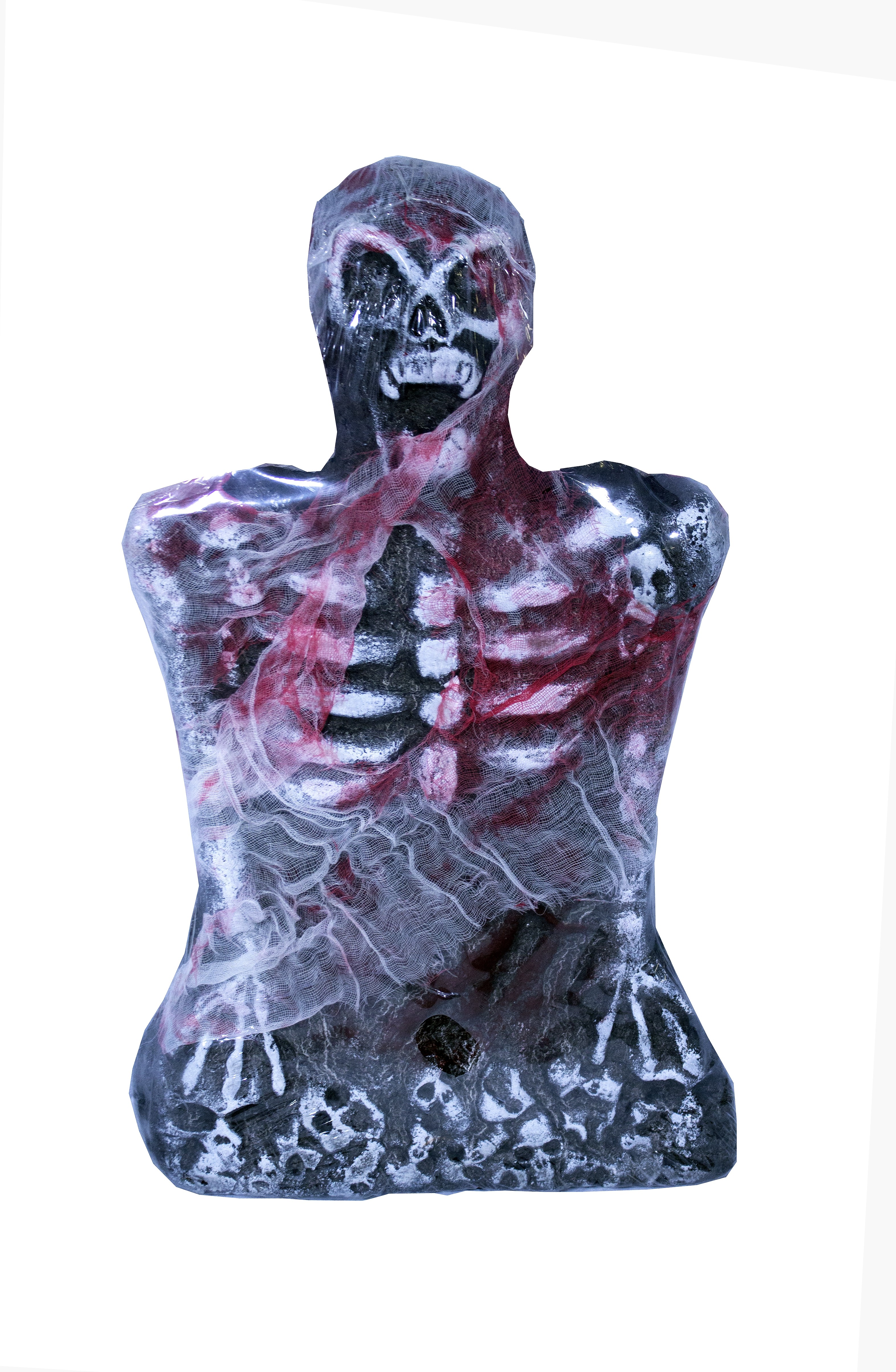 Надгробие Торс скелета отлично подойдет для декорирования помещений и двора на Хэллоуин. Надгробие выполнено из пенопласта темного цвета. Надгробие дополнено марлевой серой тканью с кровавыми искусственными пятнами.