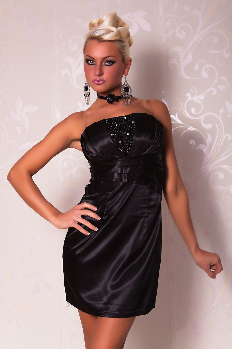 Атласное платье-бандо - это мини-платье без бретелек, выполненное в черном цвете. На груди имеются вертикальные сборки и вставка между ними с белыми небольшими стразами. Под лифом имеются декоративные пояски.