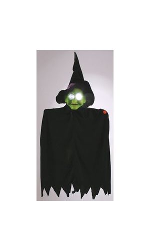 Подвесной говорящая ведьма высотой 60 см может быть подвешен на стене или потолке. Особенностью этой декорации к Хэллоуину являются яркие светящиеся глаза. Свечение глаз может быть постоянным либо моргающим. Батарейки в комплект НЕ входят. Рекомендации по уходу: Чистка только по месту загрязнения.