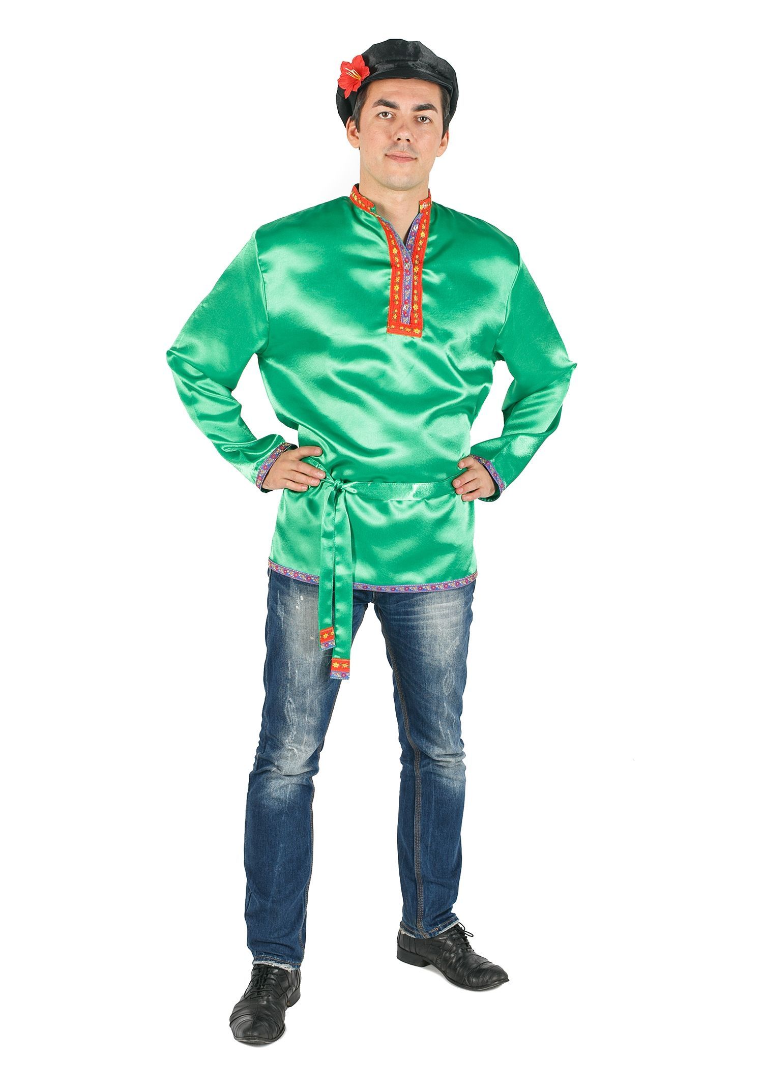 Косоворотка для взрослых зеленая из атласного материала с отделкой из узорчатой тесьмы прекрасно подойдет для выступлений в различных спектаклях и тематических праздников. К ней прилагается зеленый атласный пояс.
