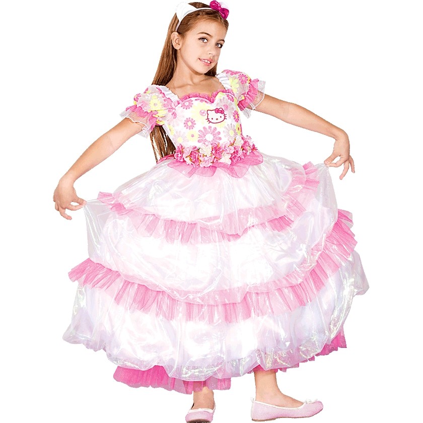 Цветочное платье Hello Kitty - бело-розовое длинное платье с многослойной пышной юбочкой с розовой оборкой. Топ платья украшен цветочным принтом и милой мордочкой Hello Kitty. Также его украшает цветочный пояс.