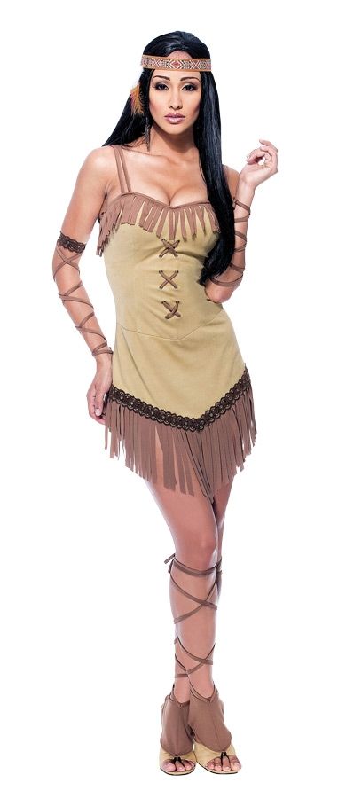 Мужчины всегда любили природную красоту женщины, поэтому национальный костюм индейской женщины не отличается яркими красками, вся красота заключается в простоте и изяществе. Короткое платье на двойных лямочках декорировано бахромой, руки и ноги переплетены лентами, а голову украшает повязка с рисунком.