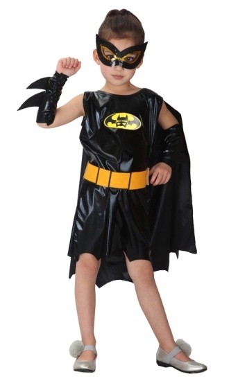 Детский костюм обаятельной Бэтгел включает в себя черное платье с эмблемой на груди и прикрепленным плащом, широкий ремень, нарукавники и маску на глаза.