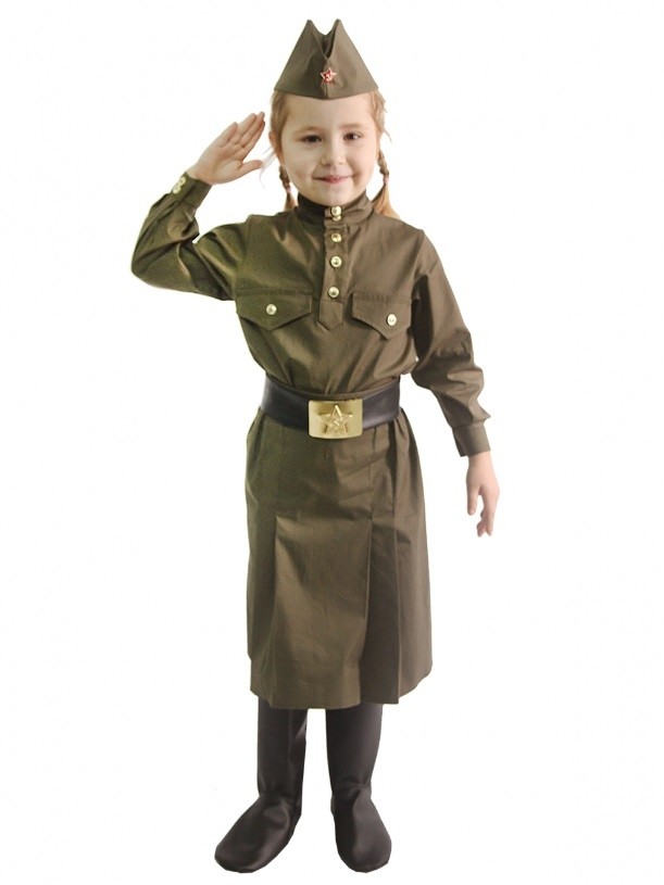 Подростковый военный комплект для девочек - комплект, выполненный из хлопчатобумажного материала. В комплект входит юбка чуть ниже колена, гимнастерка с золотистыми пуговицами на вороте и манжетах, черный ремень из кожзаменителя и пилотка, украшенная небольшой звездочкой.