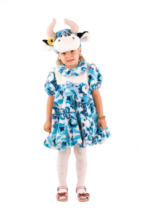 Детский карнавальный костюм голубенькой коровки для девочек. Этот костюм идеальный вариант для маленьких фантазерок, которые привыкли выбирать что-то нестандартное и оригинальное. Что же может быть оригинальнее голубенькой коровки?