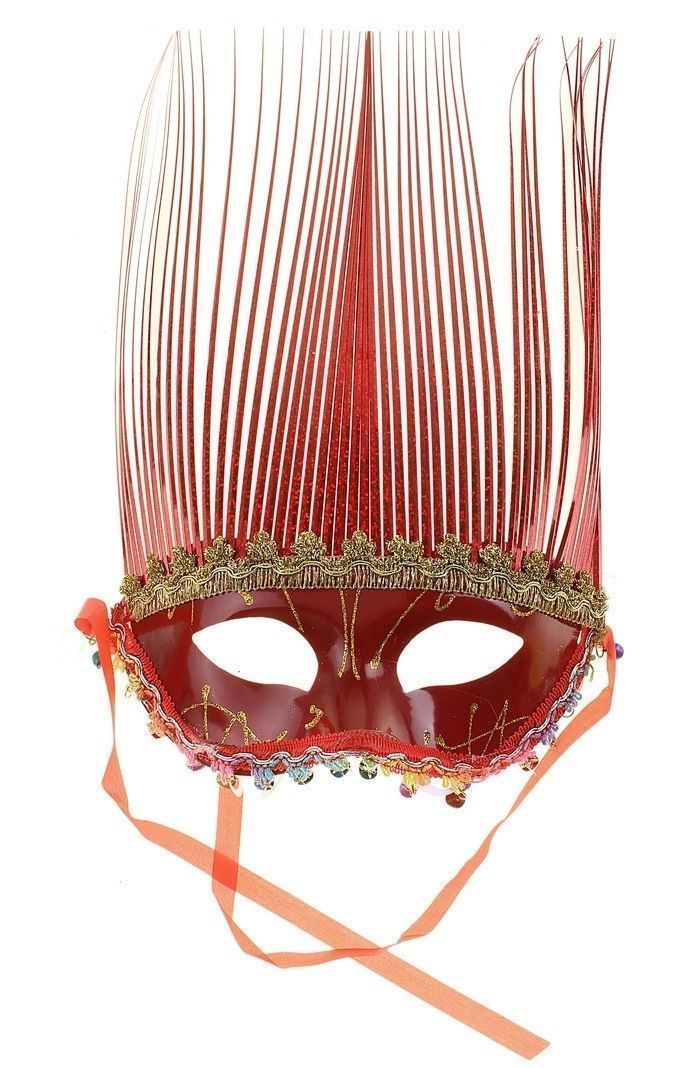 Карнавальная маска нимфы красного цвета с золотистой отделкой сверху и разноцветными бусинками снизу. Размер маски 20х36 см.