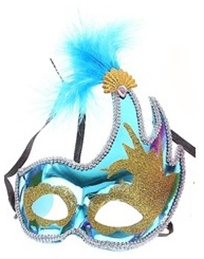 Асимметричная маска голубого цвета с золотистой окантовкой и ярким голубым пером. Маска также декорирована оригинальным камнем. Маска имеет размер 17х20 см.