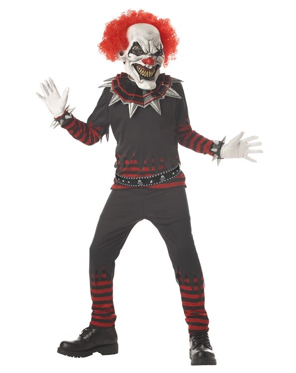 Детский костюм дьявольского клоуна идеален для того чтобы испортить веселую вечеринку своим появлением. В комплекте костюма имеется кофта с длинными рукавами и шипастыми манжетами, также имеются черные брюки с красными полосками, воротник с шипами и жуткая маска с прикрепленными красными волосами.